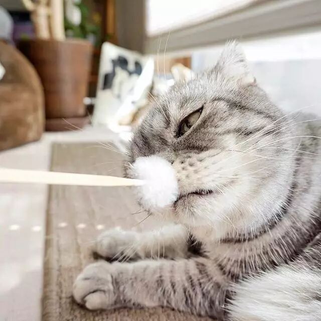 主人对它这幅模样也是非常没办法,怎么办呢,啊,有了,要不试试逗猫棒?