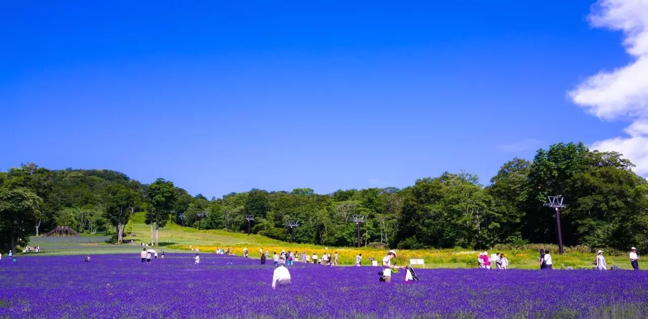 在海拔1300米的高原,种植有5万株熏衣草,从7月上旬起,那些早开品种的薰衣草就会陆续绽放,直到8月下旬,仍可观赏晚开品种的薰衣草。整整一个多月的花海观赏期,花儿们期待着游人们的到访。众所周知,薰衣草的香味有着舒缓安眠的作用,其香常被用于芳香疗法之中。走进薰衣草花园的瞬间,便被花香所包围,身心同时都能得到放松,面对美丽的花海,相信你能够理解何为可以全身感受的日本绝景了。
