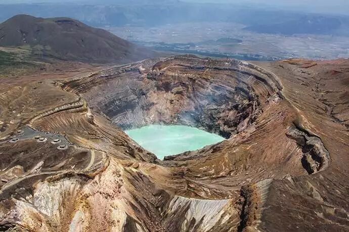 火山臼是约27万年-9万年前的4次火山喷发后形成的。之后,火山臼内再次喷发,中心区域形成了5座山峰“阿苏五岳”。火山臼周围是海拔约900米的外轮山,其中的一处山峰是“大观峰”,从这里能眺望到阿苏五岳全景,形似一座涅磐佛(横卧的佛祖)。