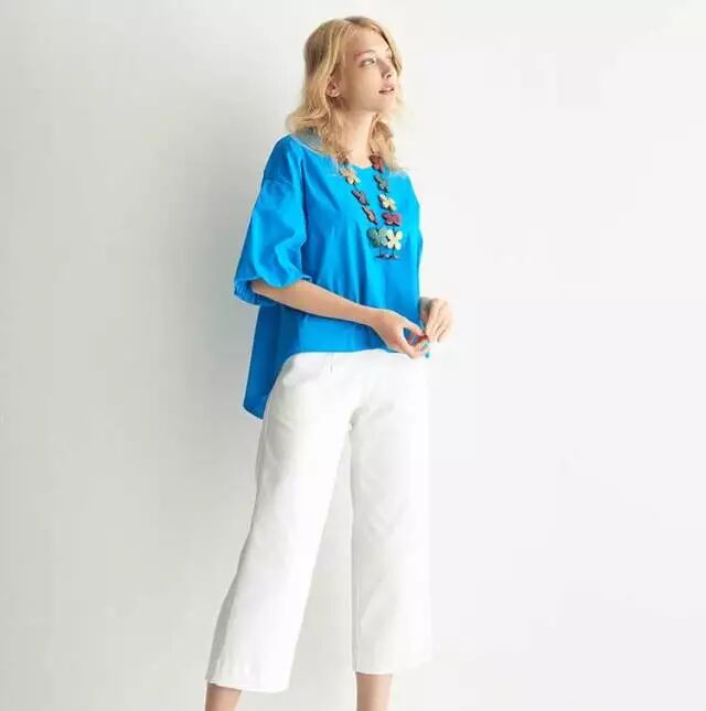 和一般的罩衫不同,这款蓝色罩衫采取了不规则的特色裁剪,看起来更加飘逸自然。可以作为基本单品,和各种下装搭配。