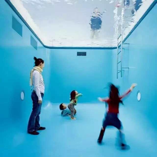 它巧妙地在天窗上注入一些水,再设计上假的泳池扶手,变成了一个以假乱真的泳池。“泳池”下方游客照常走动,形成了一个奇妙而错综的艺术(zipai)空间。