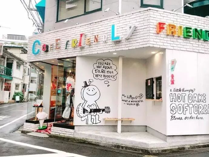 代官山的人气咖啡店“Mr.FRIENDLY cafe”,白色店面彩色LOGO就很抓眼球,这里还设置了座位专门给客人留影用哦。