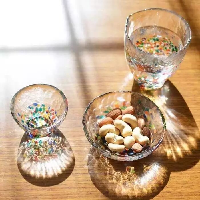 美丽的玻璃,深得日本人的厚爱,他们把它做成各种颜色、形状的工艺品和餐具。特别是在炎热的夏天,通透的玻璃给人一股清凉之感。而玻璃在国内的地位却远远不及其他材质,比如说陶瓷。因为爱喝茶的中国人需要热水来冲茶煮茶,玻璃遇上极热、极冷容易炸裂,所以并不适用。而对于日本人来说,他们爱喝清酒,搭配一套玻璃器皿再合适不过了。所以日本玻璃艺术的历史虽然很短,却发展出了自己的风格,而且十分普及,可以说是文化造就了它的美丽。