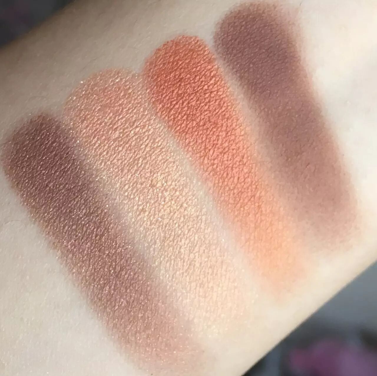 这一盘还是比较容易化出眼妆的层次感的,眼妆的化法也不算复杂。有一个很浅的橘色,一个浓郁的橘色。配上两个棕色:一个带有细闪,一个哑光。想化日常一点的妆容时,可以用淡橘色配上哑光棕,想化华丽浓郁些的眼妆时,可以用两个橘色化出层次感,再用珠光棕色压眼尾。不过新手还是要注意少量多次,好好晕染~