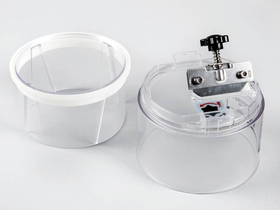 一个带螺旋纹的内盒(上图左),一个带旋钮和刀片的外盒(上图右),内盒套在外盒里面。