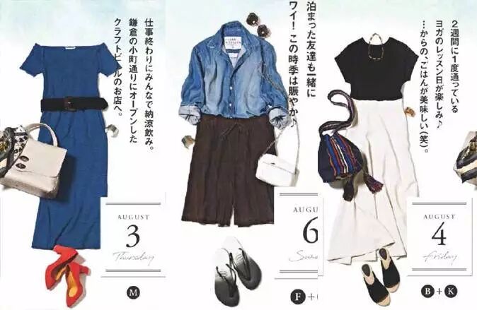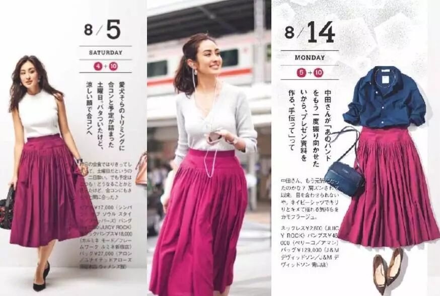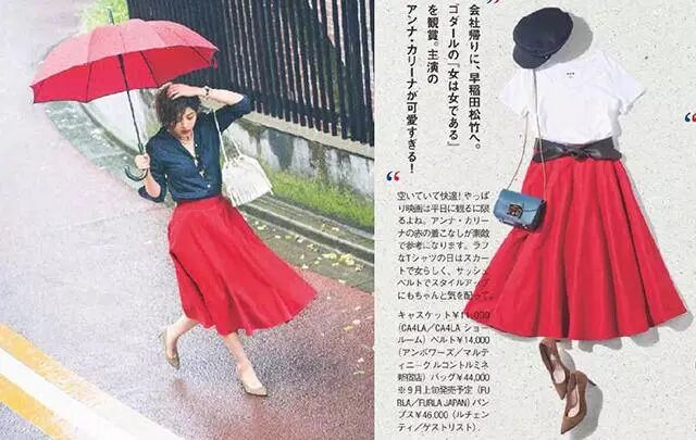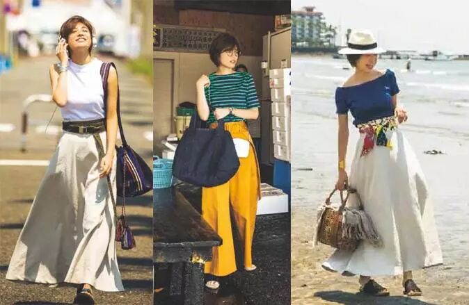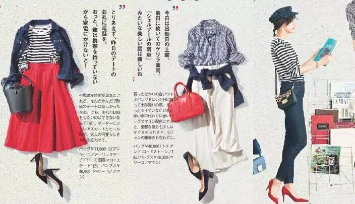 和电视剧里十元的非常时髦风格相差很大,下町女孩整体给人的感觉是:简单,擅长一衣多穿。黑白红蓝四个颜色的纯色单品组合是最常见的。一条红色长裙既可以搭配宝石蓝衬衫形成有冲击力的组合,也可以和白色无袖上衣搭配。