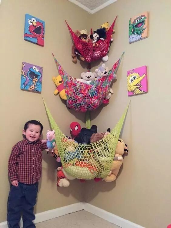 在墙角两侧钉上钉子,利用网袋装玩具,不仅省空间还很健康美观哦!
