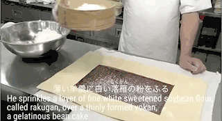在薄薄的羊羹上洒上从米、小麦、大豆、红豆等研磨而来的落粉末。这一层粉末就像很快就融化的初雪一样。
