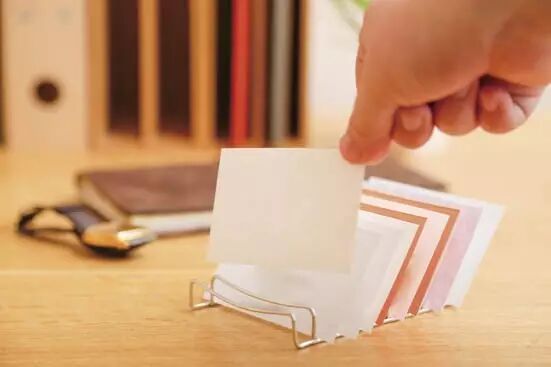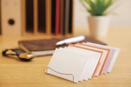比起盒子,这种开放式放置名片的方式,不但可以让客人第一时间注意到上面的内容,而且拿取很方便,更能让办公桌看上去干净清爽。