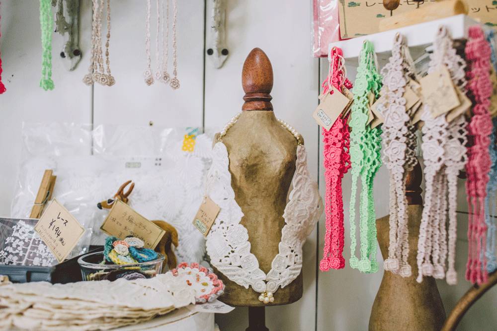 仔细看看店铺中间的篮子里,从蕾丝、布料到动物毛皮,材料种类丰富。“这部分的成品杂货不少是从以前工作时接触的伙伴手中买到的。”坂田店主继续解答着我们的好奇,“毛皮都是真的。可以用在编织物上做装饰。”