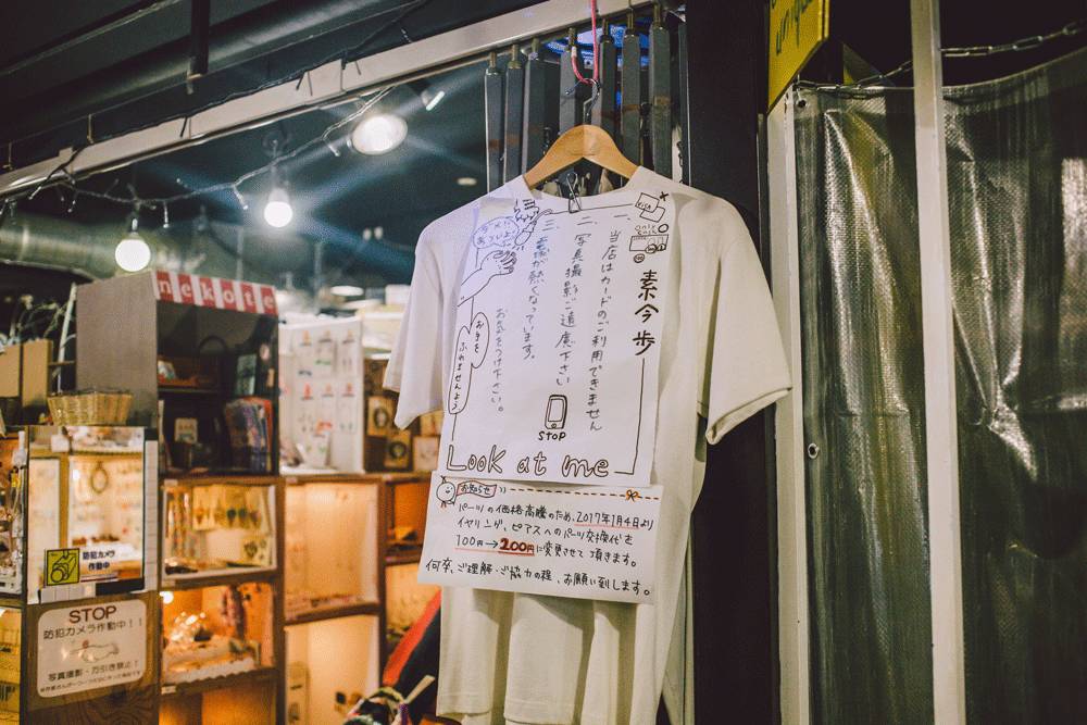 侧面柜台附近写着“请勿试穿”的日文,老板上网查找,把日语翻译成了几国语言并原样照抄了下来。看我们经过附近,他好奇地问,“汉语那里,翻译得对吗?”
