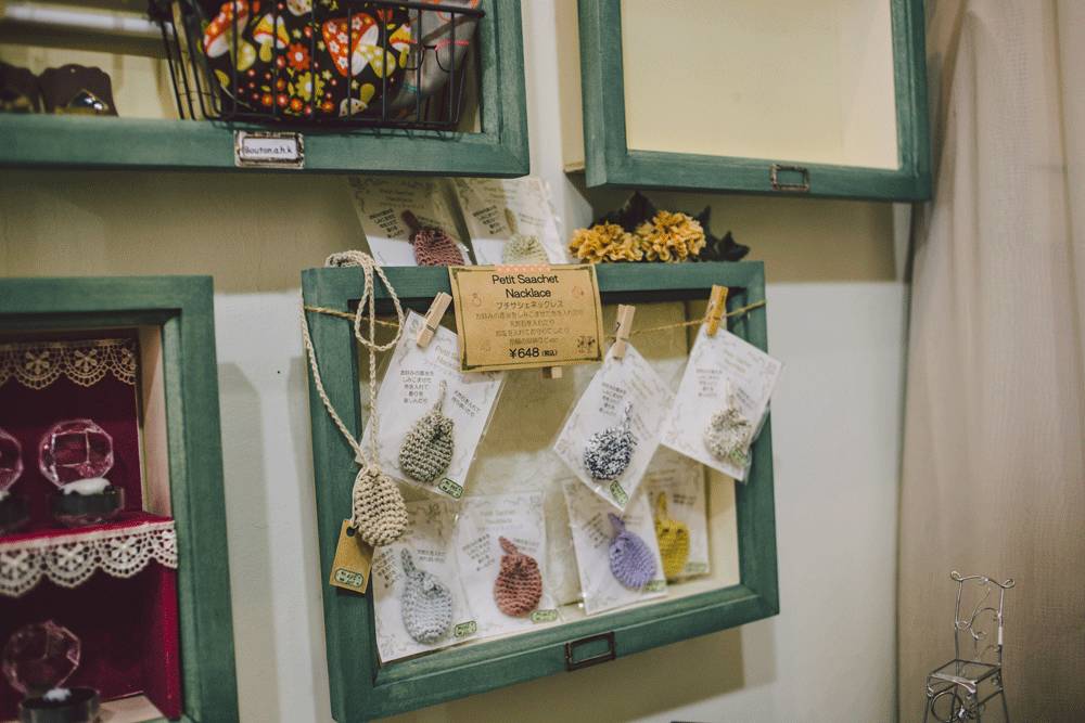 这是家多功能店铺,全称为“Handmade & 杂货店 needle!”,坐落在相对安静的“下北泽一番街”里一座三层小楼的第二层。侧面楼梯直通2楼,被手工作品装饰的楼梯引着我们推开目的地的门。打声招呼,右手边,店主从柜台后侧的门里探出头,笑容可掬,全身的装扮就是你心中最经典的手作人的形象。