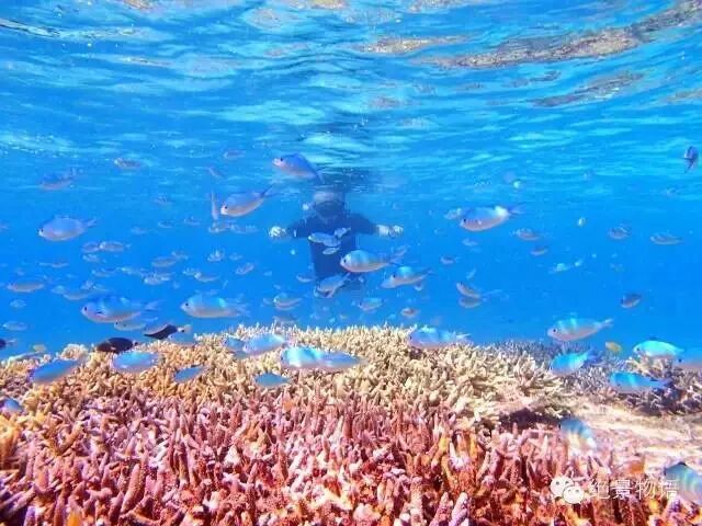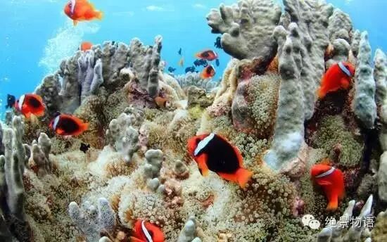 在这里浮潜就可以观赏到大量的珊瑚和热带鱼群。水下的珊瑚世界,在阳光照射下,呈现出红、黄、蓝绚丽的色彩。