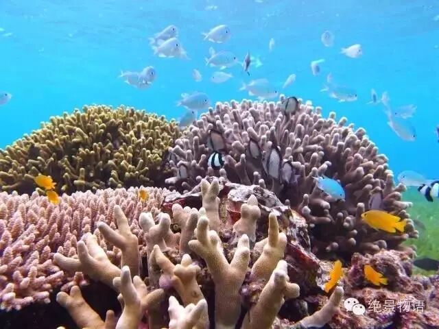 珊瑚海的周围几乎没有河流注入,从而养育了庞大的珊瑚群体,形成了一个个色彩斑驳的珊瑚岛礁。镶嵌在碧波万顷的海面上,构成了一幅幅绮丽壮美的图景。