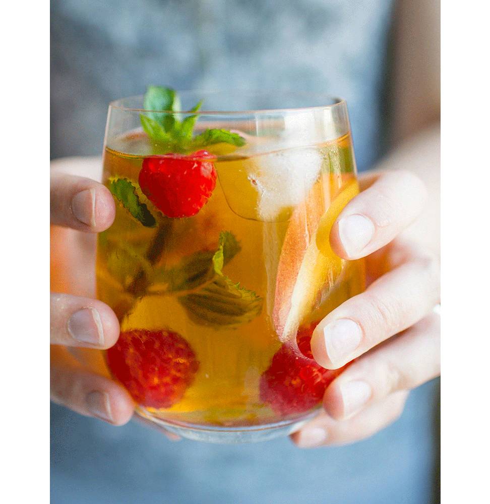 ③ 取2汤勺糖浆倒入杯中,加入冰块、剩余的桃子、树莓和乌龙茶,搅匀。