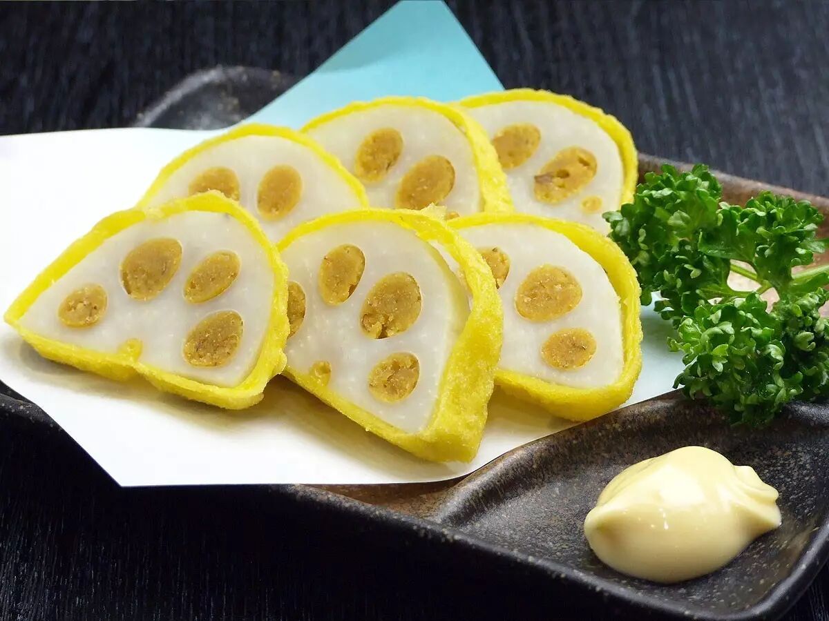 将莲藕洗净后切除两端,放入沸水中煮15分钟左右后晾干,将味噌、辣椒粉和蜂蜜混合制成的辣味噌填入莲藕的孔隙中,放置5小时以上,然后裹上加入了姜黄粉的炸衣炸制而成。
