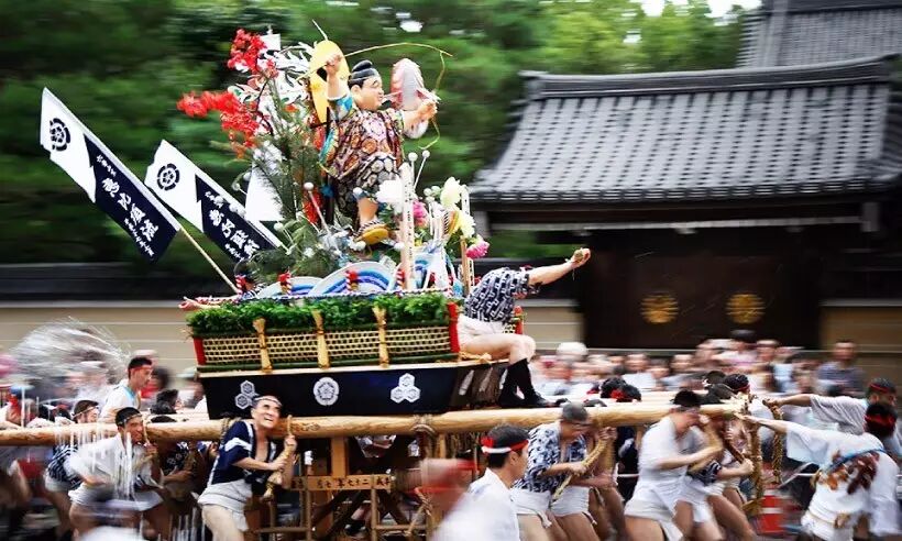 福冈县福冈市的博多区,每年7月1日到7月15日都会举办有着700年以上传统的博多祗园山笠祭。山笠,即在神社的祭礼中所使用的神车状礼具。届时男性会穿着传统服饰担着山笠在市内游行。