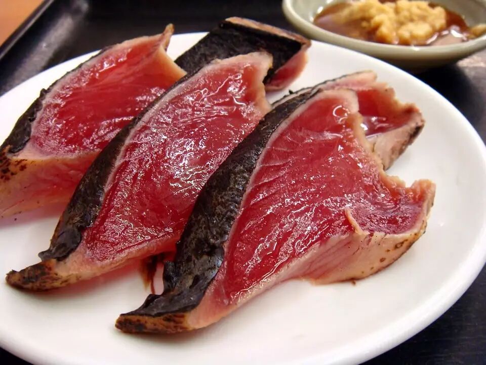 鲣鱼拍松算是刺身的一种,为高知县的代表性美食。将鲣鱼用稻草烤炙,使其表面微焦产生香气,而内部依然鲜美多汁,切成约1厘米厚的片状,搭配香料或酱汁食用。