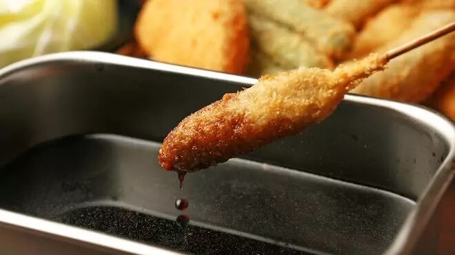 炸串是大阪地区的名小吃,一般是将肉类、鱼贝类、蔬菜等穿成串,裹上炸衣后炸制后,蘸酱汁食用。
