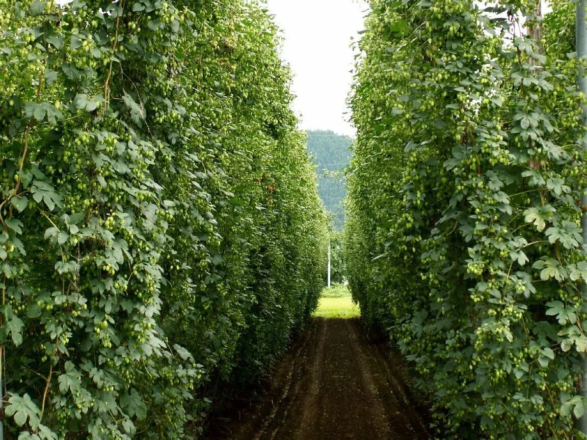 每年7月到8月,是观赏啤酒花田的最佳时期,和葡萄一样采用架式栽培的啤酒花,远远看上去就像绿色的帘幕。