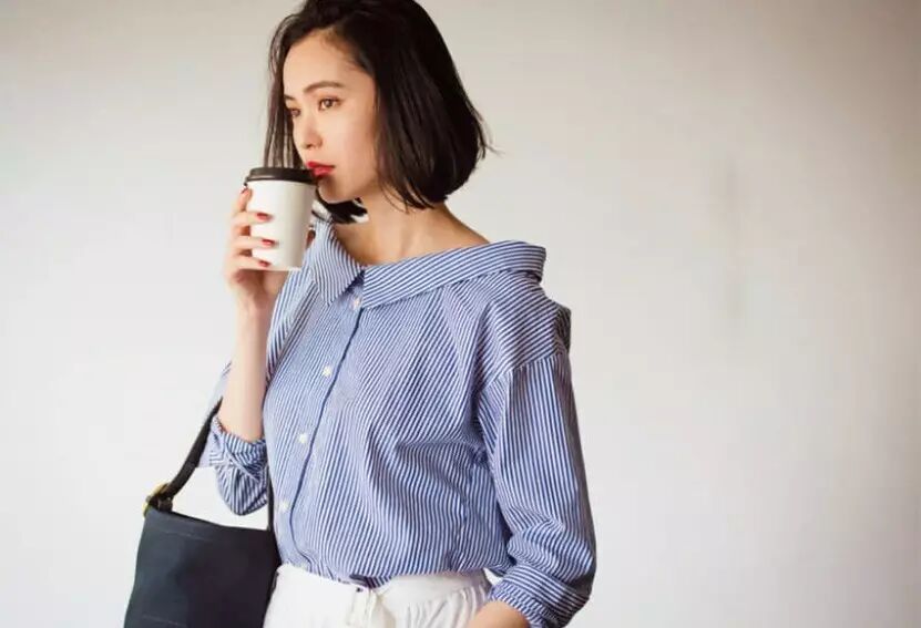 正面看似普通的条纹衬衫,其实藏有性感的小心机,后颈至肩部恰到好处的“裸露”成为当季热点。