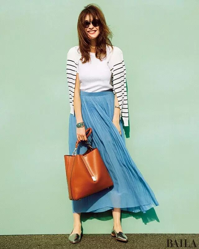 ➤ 随风摆动的蓝色百褶裙搭配条纹针织衫,显得人温柔大方、清爽利落。