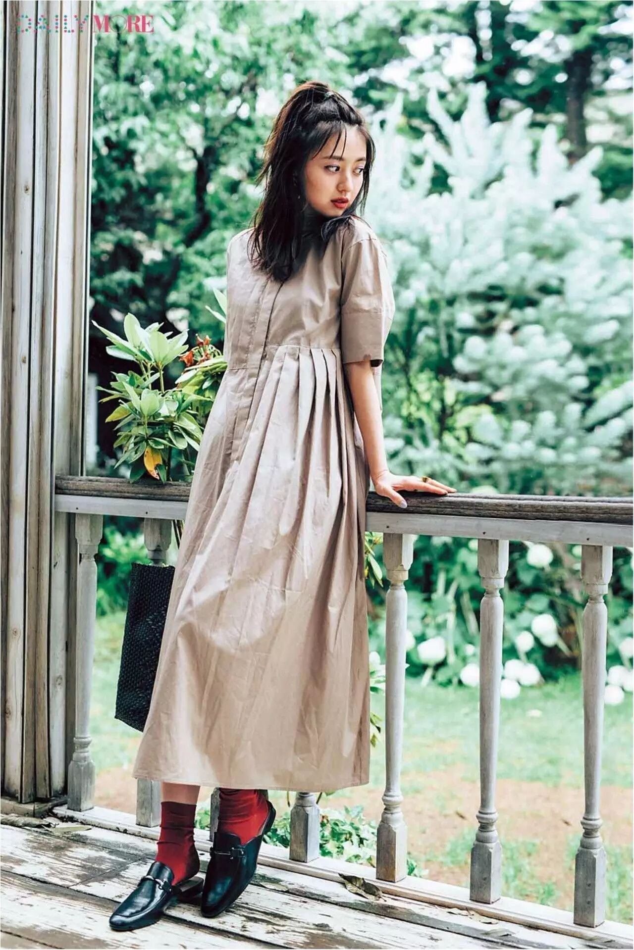 ➤ 想让纯色衬衫连衣裙不单调,可以像下图模特一样,搭配一双亮色袜子。