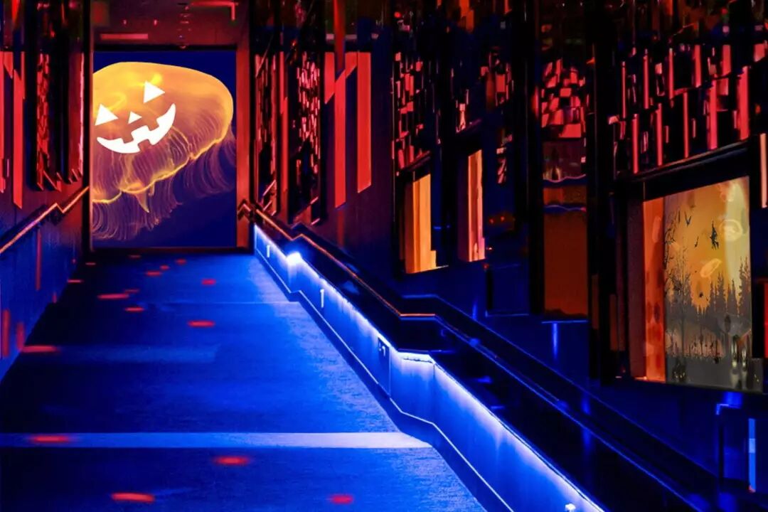墙壁上是南瓜水母、鬼魂水母等应节影像的投影,耳朵里传来万圣节主题BGM,万圣节风格的水族馆,别有一番风味。