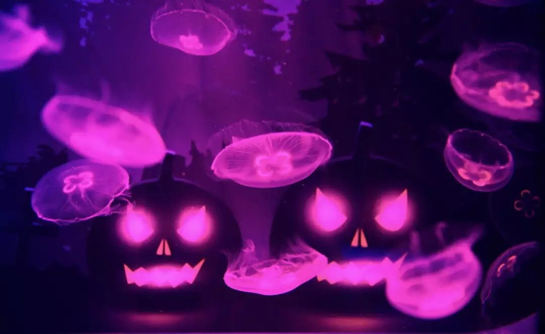 馆内的八个水母水槽内将会放置魔女、南瓜等万圣节图案,让水母们“与魔共舞”。这么有气氛的海洋生活课,不来一堂吗?