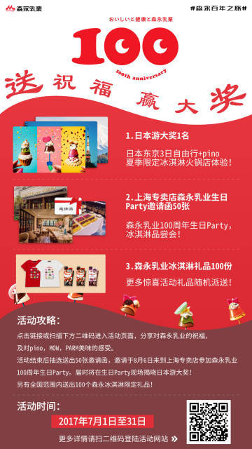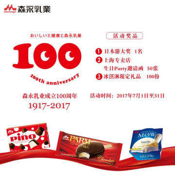 2017年07月22日日本国民品牌森永乳业100岁啦 小伙伴们快来一起为他过生日吧 戳图9就有机会赢取日本3日自由行+pino冰淇淋火锅店体验 、森永100周年上海生日趴邀请函(50名)以及百份限定礼品!机会多多哟 网页链接 BTW魔都的小伙伴在便利店就可以买到森永冰淇淋了哟