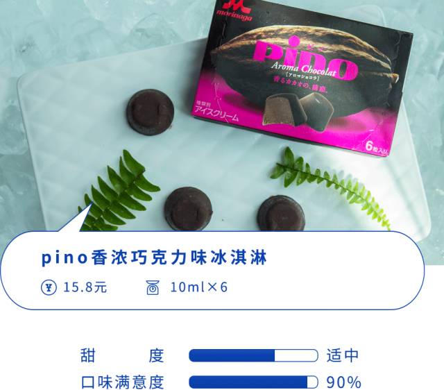 初次尝试的话,这盒香草冰淇淋和巧克力外壳的经典组合已经足够将你圈粉了,将pino放在嘴里含一会儿,等外壳的巧克力慢慢融化,然后一抿,香草味迅速在口腔里蔓延,和巧克力以非常完美的比例相互融合,奶香浓郁,口感细腻,回味持久。恐怕很难找到不喜欢它的人了吧,至少我局试吃下来,没有一票差评,至于为什么它的口味满意度只有80%?因为没比没伤啊,这个系列可是有比基础款更绝妙的味道存在啊!