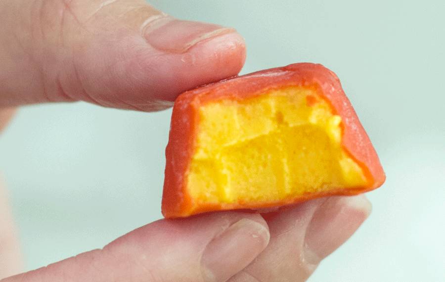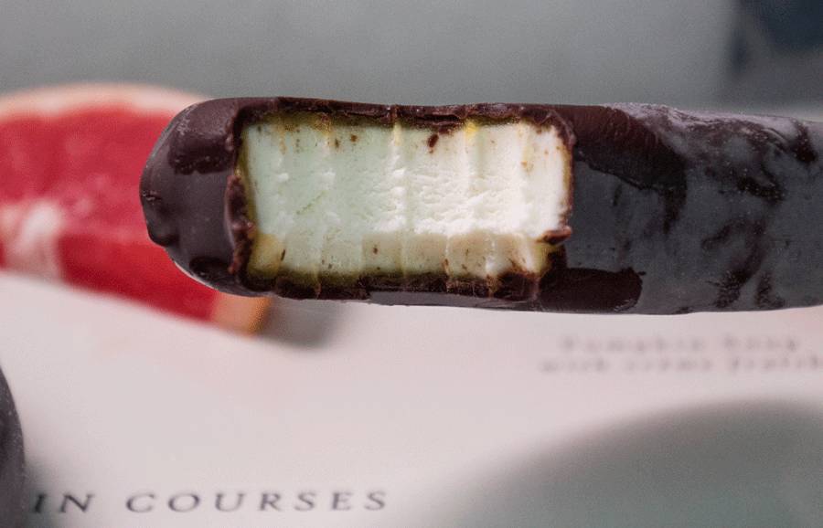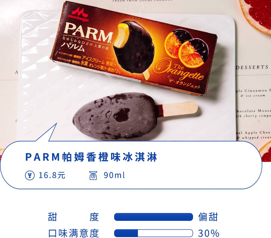脆皮和冰淇淋中间夹着薄薄一层果味浓郁的香橙果酱,也正是这层酸酸甜甜的果酱,中和掉了一些甜腻感,让香橙味PARM比原味的整体感觉更清爽一些。当然,也有很多探员表示不能接受橙+巧克力这种设定,如果你喜欢橙子味,可以试一试。