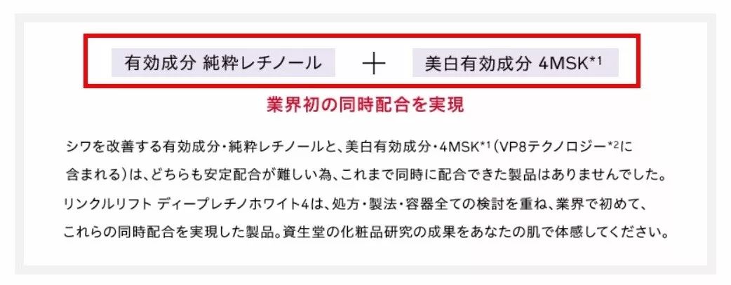 查了一下官网,这个新出的资生堂“小针管”里有悦薇珀翡系列共通的资生堂VP8全效肌能配方,含有资生堂独家的药用美白成分4MSK,资生堂家很多美白系列里面都有的一个成分,提亮肤色特别有效~▼