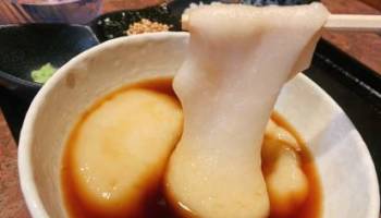 【月光】 超长拉丝的年糕你喜欢吗?沾着酱油食用,还可以按照自己口味放入芥末、芝麻、海苔、萝卜进行调味。