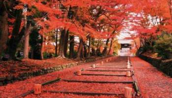 京都毗沙门天一到秋天,石阶被红叶染成火焰般的红色。