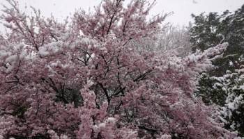 今天早上11点左右东京都内、多摩地区下雪了,唔,盛放的樱花被雪裹了一层。(twi:ranta37)🌸❄️🌸❄️
