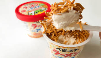 夏季冰品大战即将开启,日本711推出限量发售的点心面冰淇淋,打开盖子是满满的点心面,基底是奶油焦糖口味冰淇淋,混合了点心面酥脆口感的冰淇淋,甜甜咸咸的口感难以想象,想吃~